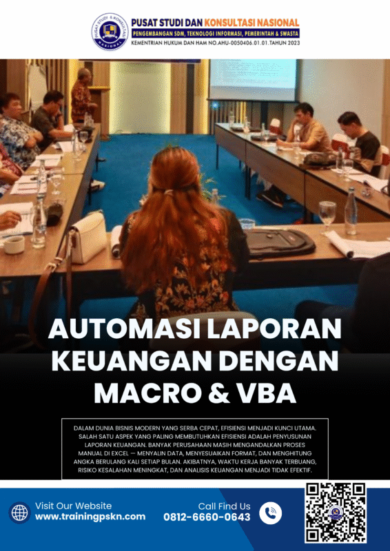Di sinilah Macro dan VBA (Visual Basic for Applications) berperan penting. Keduanya memungkinkan pengguna Excel untuk mengotomatisasi berbagai tugas, mulai dari perhitungan kompleks, pembuatan laporan rutin, hingga integrasi data lintas file. Melalui pelatihan dan praktik yang tepat, pengguna dapat mengubah proses keuangan yang repetitif menjadi sistem yang berjalan otomatis hanya dengan satu klik.