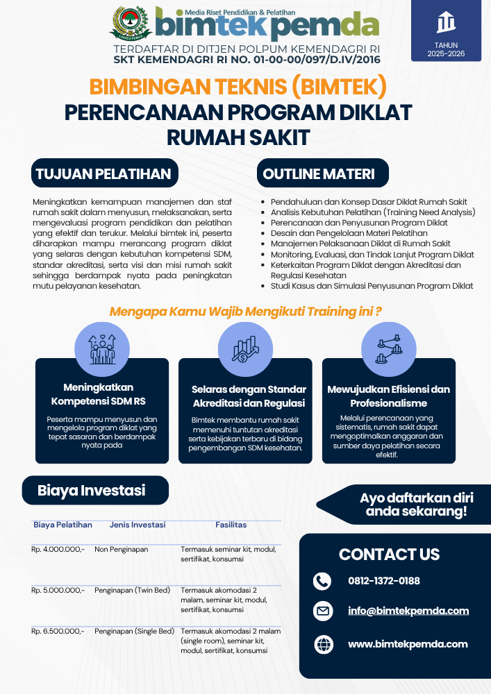 Dalam era pelayanan kesehatan yang semakin kompleks, program pendidikan dan pelatihan (diklat) bagi tenaga di rumah sakit menjadi sangat strategis. Melalui bimbingan teknis (bimtek) yang tepat, rumah sakit mampu meningkatkan kompetensi SDM, sistem manajemen, dan kualitas layanan. Artikel ini membahas secara komprehensif tentang bagaimana menyusun dan melaksanakan program diklat di lingkungan rumah sakit dengan pendekatan profesional dan terstruktur—dengan fokus utama pada Bimbingan Teknis Perencanaan Program Diklat Rumah Sakit.