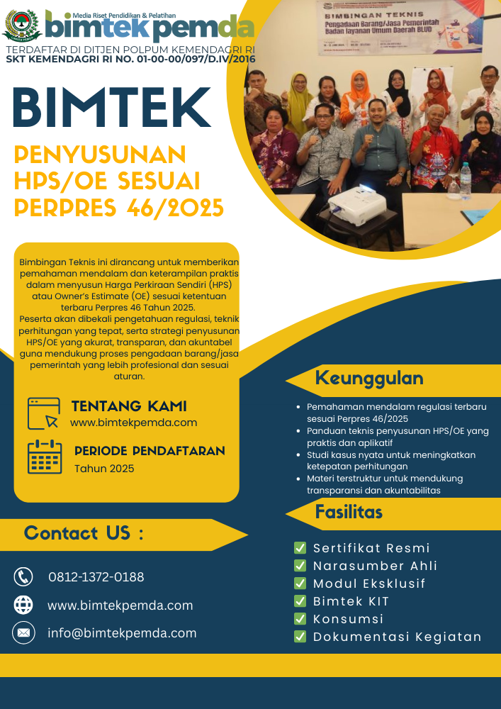 Pengadaan barang dan jasa pemerintah merupakan salah satu aspek penting dalam tata kelola keuangan negara. Salah satu instrumen yang sangat menentukan keberhasilan proses ini adalah Harga Perkiraan Sendiri (HPS) atau Owner’s Estimate (OE). Melalui HPS/OE, pemerintah memiliki acuan harga yang transparan, realistis, dan sesuai dengan standar regulasi. Perpres 46/2025 hadir sebagai pedoman terbaru yang memperkuat tata kelola penyusunan HPS/OE. Artikel ini akan membahas secara komprehensif pentingnya Bimbingan Teknis (Bimtek) Penyusunan HPS/OE sesuai Perpres 46/2025, lengkap dengan manfaat, langkah teknis, tantangan, serta solusi praktis.