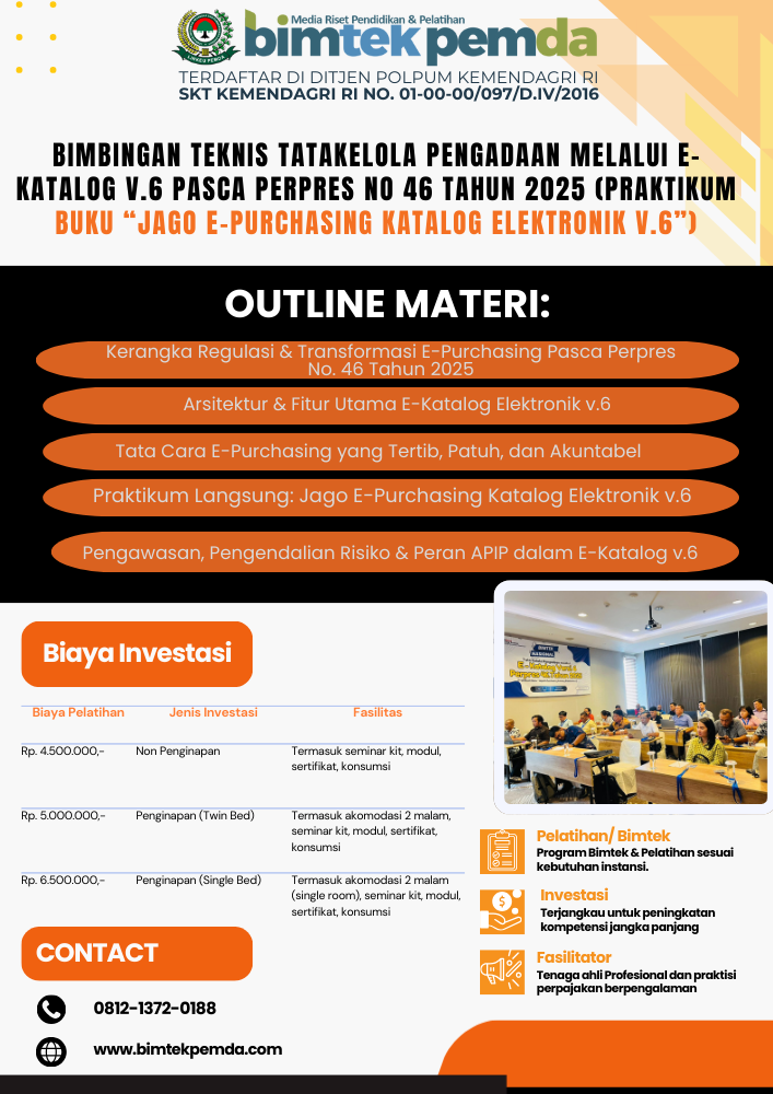 Bimbingan Teknis Tatakelola Pengadaan melalui E-Katalog v.6 Pasca Perpres No 46 Tahun 2025 merupakan langkah strategis untuk memastikan pengadaan barang dan jasa berjalan sesuai regulasi, efisien, dan akuntabel. Dengan pendekatan praktikum berbasis buku “Jago E-Purchasing Katalog Elektronik v.6”, bimtek ini tidak hanya meningkatkan pemahaman, tetapi juga kesiapan implementasi di lapangan.