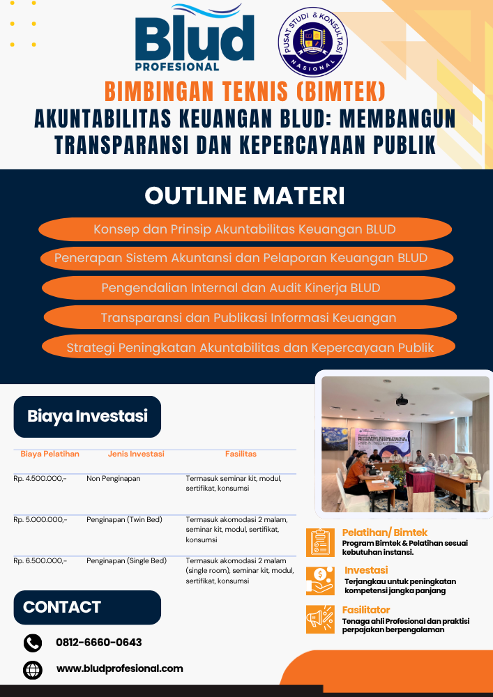 Melalui Bimbingan Teknis (Bimtek) Akuntabilitas Keuangan BLUD, pemerintah daerah dan pengelola unit layanan dapat memperkuat sistem tata kelola, meningkatkan kepercayaan publik, serta membangun budaya transparansi yang berkelanjutan. Artikel ini akan mengupas secara komprehensif bagaimana Bimtek berperan penting dalam menciptakan BLUD yang akuntabel, produktif, dan dipercaya masyarakat.