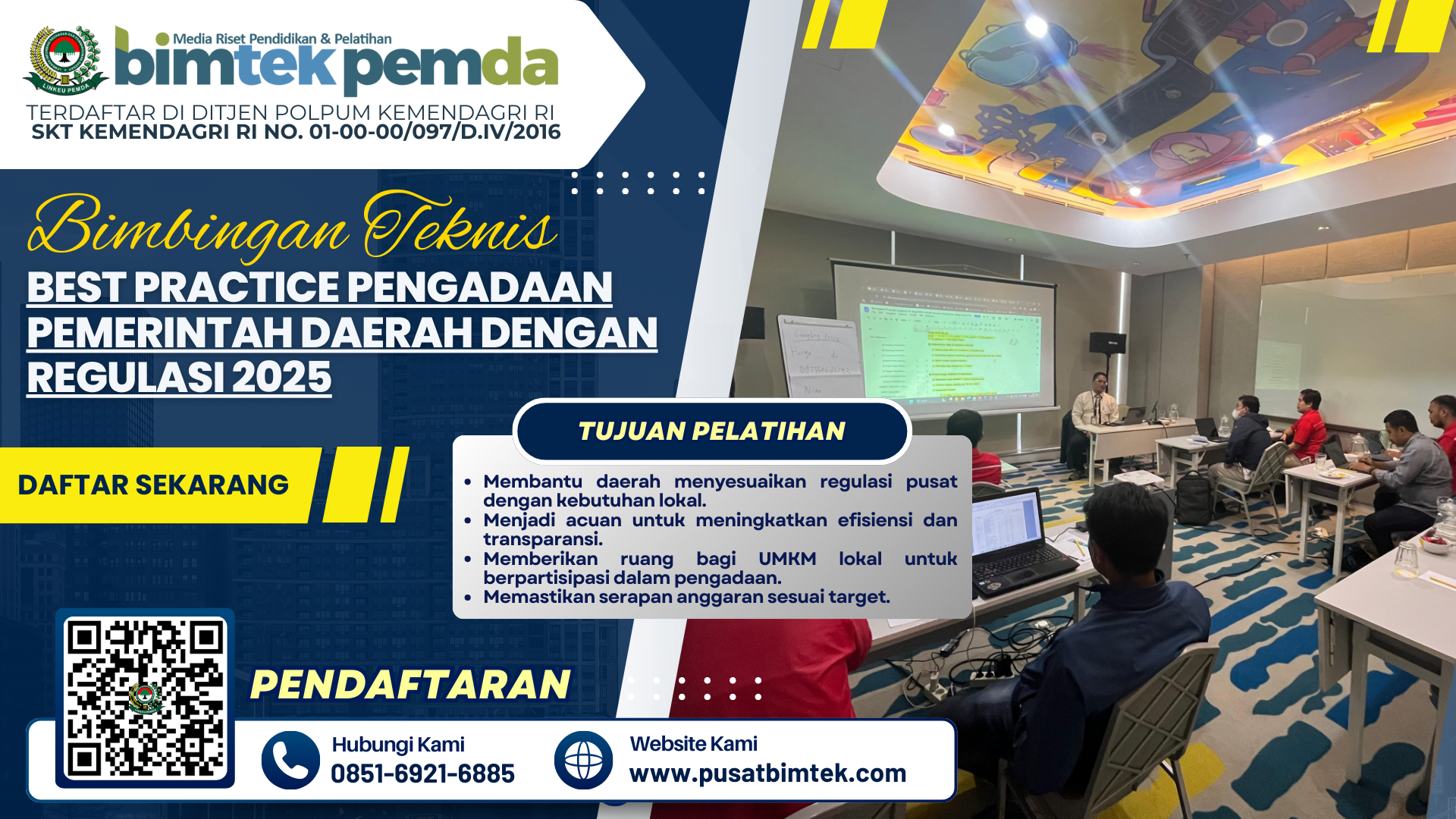 Bimtek Best Practice Pengadaan Pemerintah Daerah dengan Regulasi 2025 merupakan kunci dalam memperkuat tata kelola pengadaan yang modern, transparan, dan inklusif. Regulasi baru memberikan kerangka kerja yang sederhana dan digital, tetapi hanya akan efektif jika didukung dengan praktik terbaik di daerah.