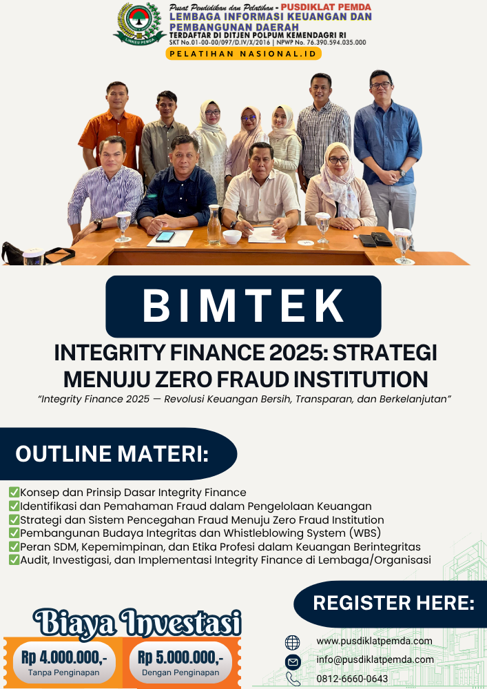 Dalam era yang semakin kompleks dan terdigitalisasi, tantangan pengelolaan keuangan bukan lagi hanya soal efisiensi dan efektivitas—melainkan juga soal integritas, kepatuhan, dan pencegahan kecurangan (fraud). Program Bimtek Integrity Finance 2025: Strategi Menuju Zero Fraud Institution hadir sebagai langkah strategis dan komprehensif untuk membangun institusi keuangan publik maupun swasta yang bebas dari kecurangan, memiliki tata kelola yang kuat, dan mampu menjaga kepercayaan publik.