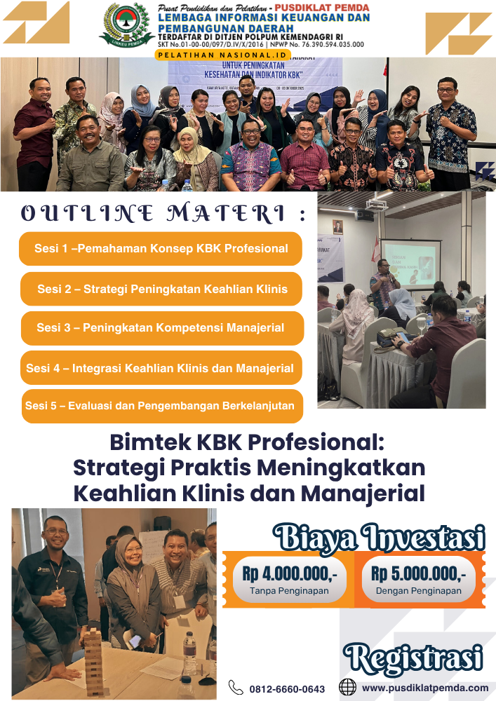 Bimtek KBK Profesional merupakan solusi efektif untuk meningkatkan keahlian klinis dan manajerial tenaga kesehatan. Melalui metode terstruktur, simulasi kasus nyata, dan pendekatan manajerial yang aplikatif, peserta tidak hanya mendapatkan pengetahuan, tetapi juga kemampuan praktis yang siap diterapkan di lapangan.