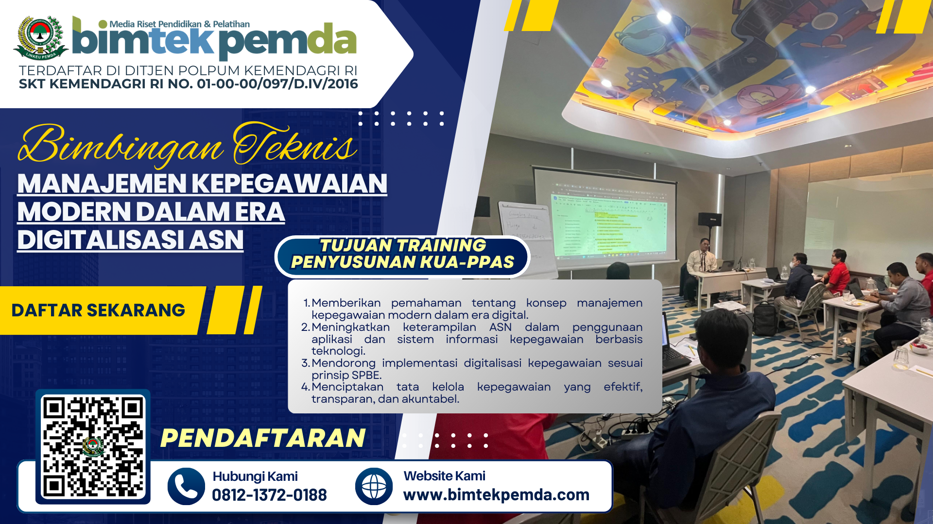 Segera daftarkan instansi Anda untuk mengikuti Bimtek Manajemen Kepegawaian Modern terbaru bersama narasumber berpengalaman dan profesional. Tingkatkan kualitas ASN Anda sekarang juga untuk masa depan birokrasi yang lebih maju dan terpercaya.