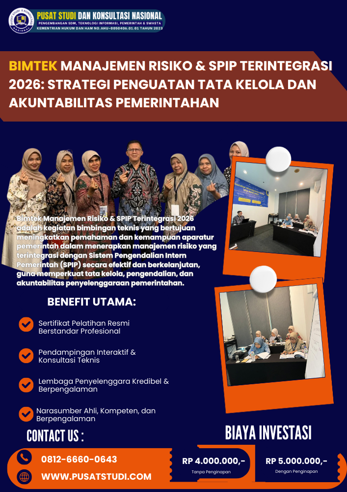 Segera tingkatkan kapasitas aparatur dan perkuat pengendalian intern instansi Anda melalui program Bimtek Manajemen Risiko & SPIP Terintegrasi 2026 yang komprehensif dan aplikatif.