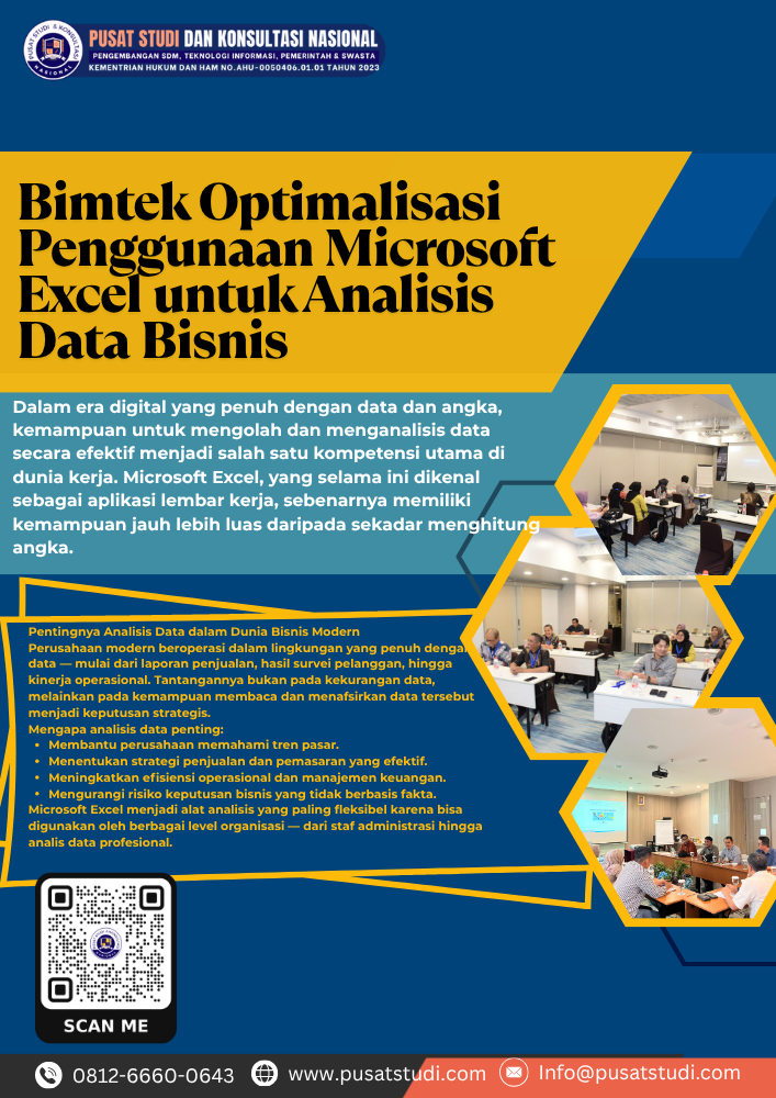 Melalui Bimtek Optimalisasi Penggunaan Microsoft Excel untuk Analisis Data Bisnis, peserta akan dibimbing untuk memahami teknik, rumus, dan fitur-fitur canggih yang dapat meningkatkan efisiensi serta kualitas keputusan bisnis. Pelatihan ini bukan hanya soal rumus, tetapi tentang bagaimana data dapat “bercerita” dan mendukung strategi organisasi.