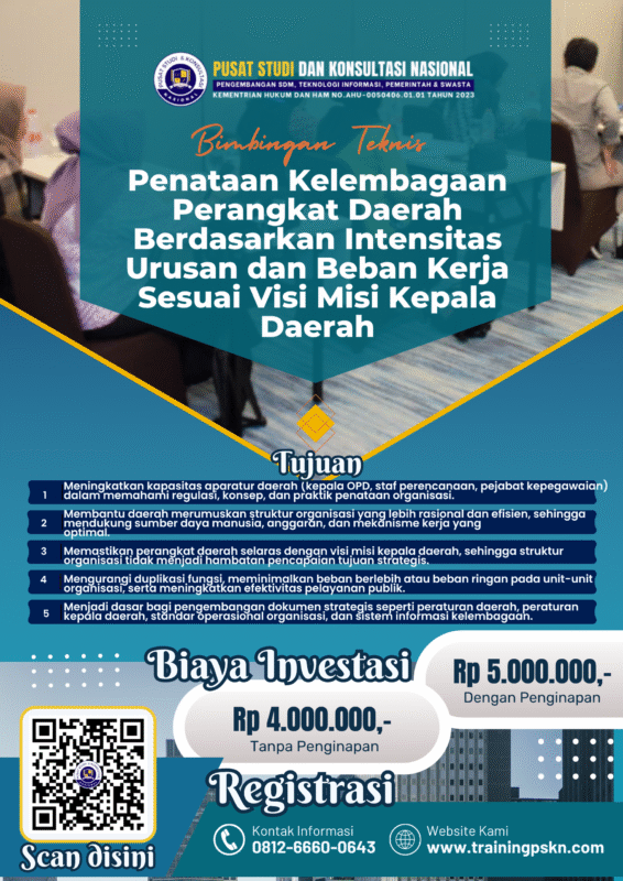 Bimtek (Bimbingan Teknis) dengan tema “Penataan Kelembagaan Perangkat Daerah Berdasarkan Intensitas Urusan dan Beban Kerja Sesuai Visi Misi Kepala Daerah” menjadi sangat relevan untuk diaplikasikan sebagai program penguatan kapasitas aparatur daerah—baik eksekutif maupun legislatif—agar dapat menjawab tantangan pembangunan, pelayanan publik, serta optimalisasi fungsi pemerintah daerah. Artikel ini disusun sebagai “artikel pilar” (pillar content) yang bisa menjadi rujukan utama dan acuan bagi konten turunan lainnya (seperti modul pelatihan, hand-book, studie kasus, dll.).