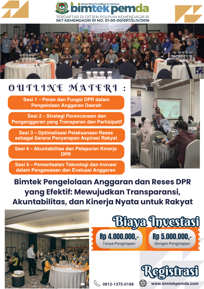 Kinerja DPR yang transparan dan akuntabel dimulai dari kemampuan mengelola anggaran dan reses secara profesional. Melalui Bimtek Pengelolaan Anggaran dan Reses DPR, setiap anggota legislatif dapat menjadi motor perubahan menuju tata kelola pemerintahan yang bersih, efektif, dan berpihak pada rakyat.