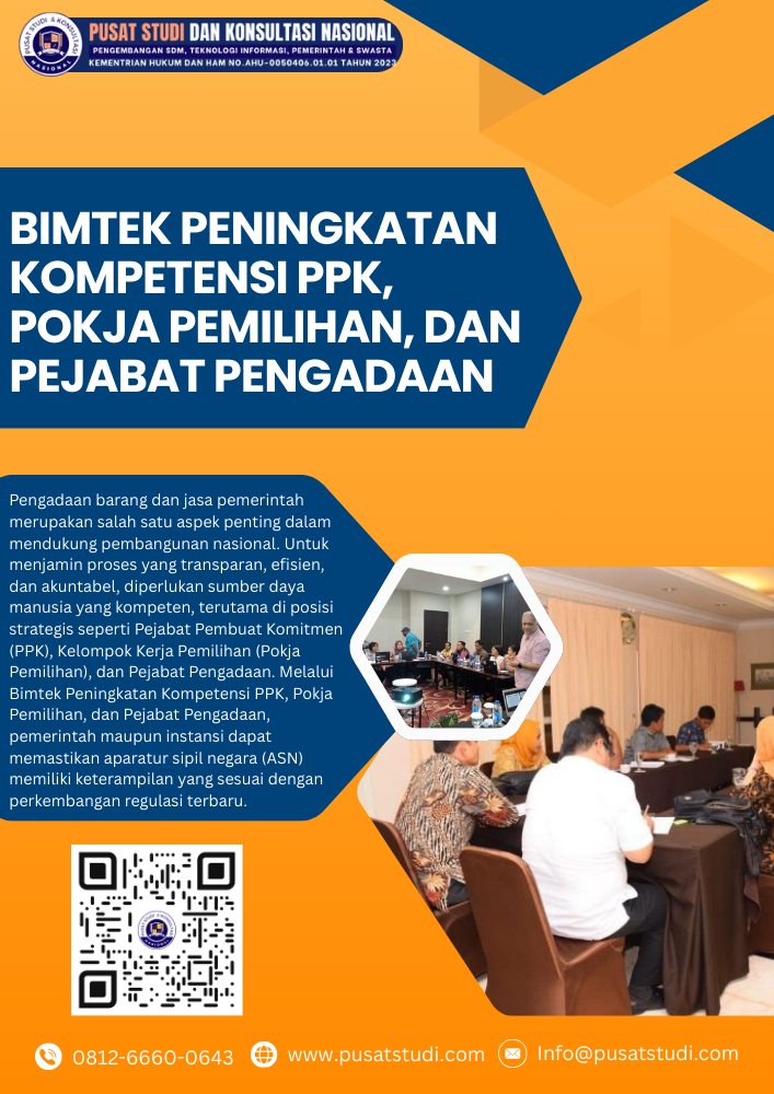 Pengadaan barang dan jasa pemerintah merupakan salah satu aspek penting dalam mendukung pembangunan nasional. Untuk menjamin proses yang transparan, efisien, dan akuntabel, diperlukan sumber daya manusia yang kompeten, terutama di posisi strategis seperti Pejabat Pembuat Komitmen (PPK), Kelompok Kerja Pemilihan (Pokja Pemilihan), dan Pejabat Pengadaan. Melalui Bimtek Peningkatan Kompetensi PPK, Pokja Pemilihan, dan Pejabat Pengadaan, pemerintah maupun instansi dapat memastikan aparatur sipil negara (ASN) memiliki keterampilan yang sesuai dengan perkembangan regulasi terbaru.