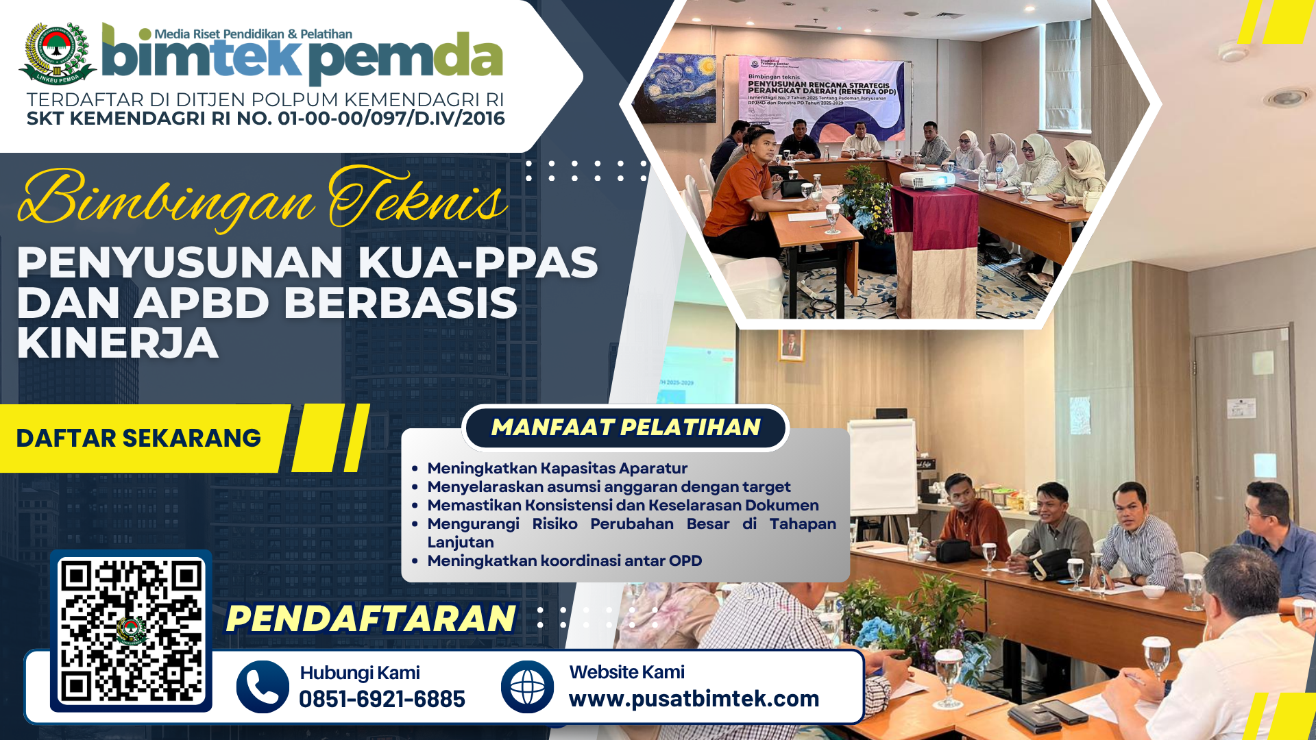 Panduan lengkap Bimtek Penyusunan KUA-PPAS dan APBD Berbasis Kinerja untuk meningkatkan efisiensi, akuntabilitas, dan hasil pembangunan daerah.