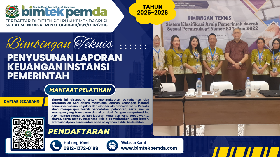 Bimtek Penyusunan Laporan Keuangan Instansi Pemerintah merupakan langkah strategis untuk memperkuat akuntabilitas dan transparansi pengelolaan keuangan negara. Sehubungan dengan itu kami dari Pusat Diklat dan Bimtek Pemerintahan Lembaga Informasi Keuangan Pembangunan Daerah (BIMTEK PEMDA) selaku penyelenggara kegiatan serta dukungan narasumber yang berkompeten dibidangnya, Mengundang Bapak/Ibu untuk mengikuti kegiatan yang akan dilaksanakan.
