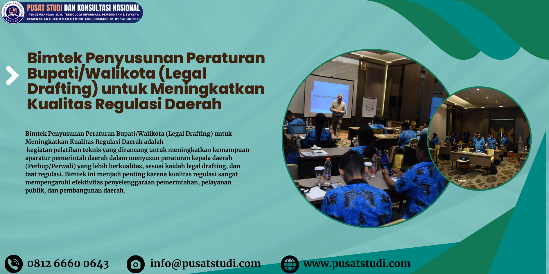Bimbingan Teknis Penyusunan Peraturan Bupati/Walikota, atau yang lebih dikenal sebagai Bimtek Legal Drafting, adalah kegiatan pelatihan yang dirancang untuk meningkatkan kemampuan peserta dalam merumuskan, menyusun, dan mengevaluasi produk hukum daerah yang sesuai dengan peraturan perundang-undangan. Fokus utama kegiatan ini meliputi penyusunan naskah akademik, teknik penulisan peraturan, harmonisasi, hingga proses fasilitasi dan pengundangan.
