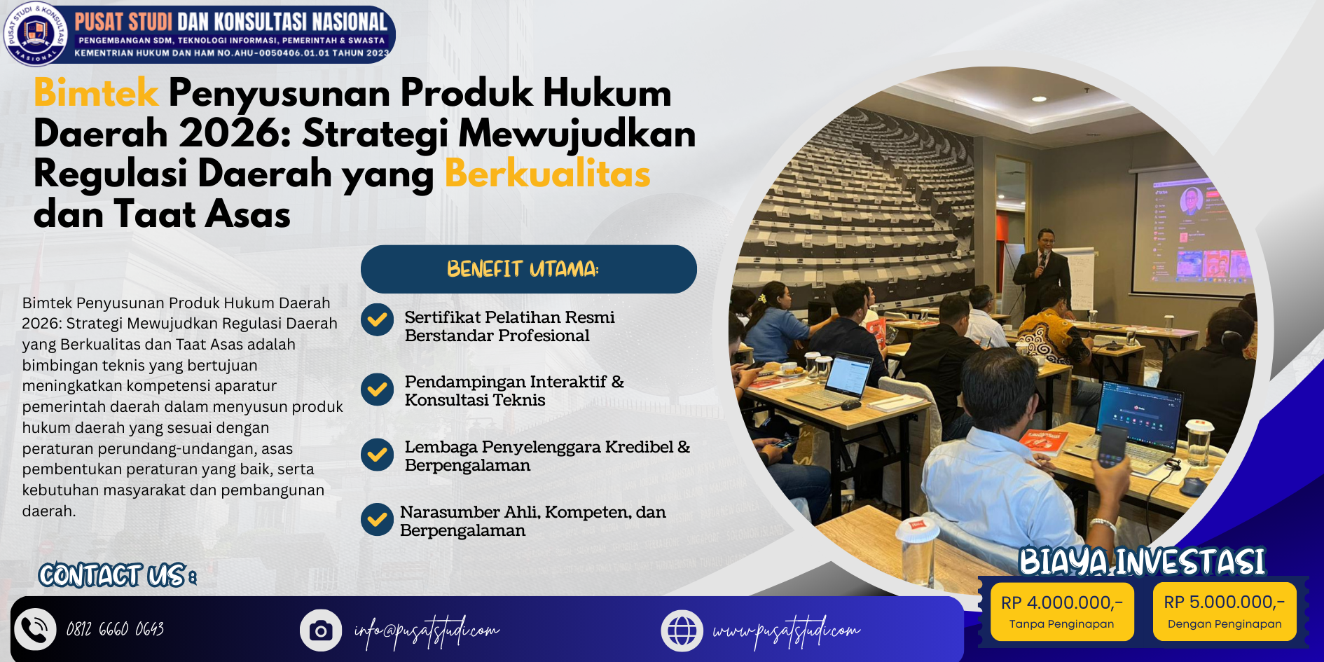 Wujudkan produk hukum daerah yang berkualitas, taat asas, dan berdaya guna melalui peningkatan kompetensi aparatur dengan mengikuti Bimtek Penyusunan Produk Hukum Daerah 2026 bersama penyelenggara pelatihan terpercaya.