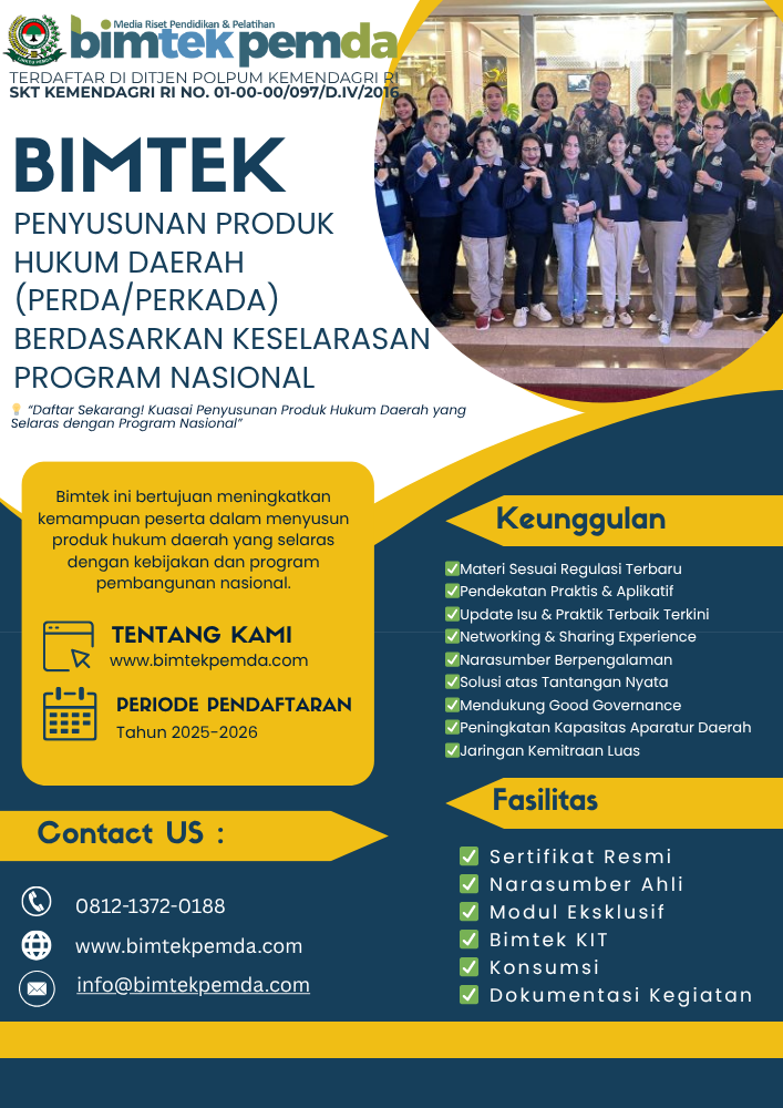 Dalam era desentralisasi dan otonomi daerah, kualitas produk hukum daerah seperti Peraturan Daerah (Perda) dan Peraturan Kepala Daerah (Perkada) menjadi sangat strategis. Melalui kegiatan bimbingan teknis (BIMTEK) yang terstruktur, perangkat daerah dan ASN dapat memahami dan menerapkan mekanisme penyusunan produk hukum yang tidak hanya sah secara prosedural, tetapi juga selaras dengan program nasional. Artikel ini didesain sebagai pillar content yang mendalam, untuk memperkuat pemahaman dan menjadi rujukan utama website pelatihan/BIMTEK.
