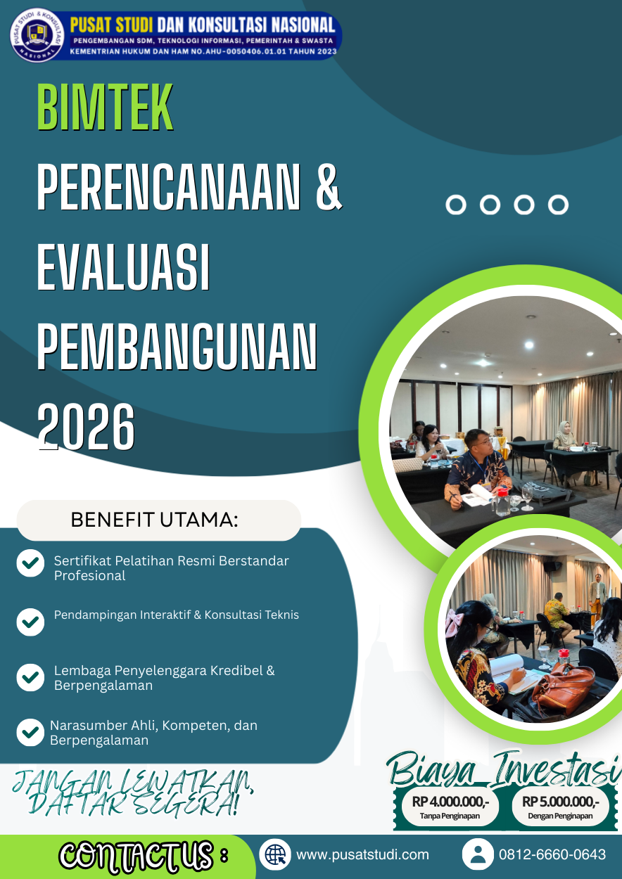 Tingkatkan kualitas perencanaan dan evaluasi pembangunan organisasi Anda melalui Bimtek Perencanaan & Evaluasi Pembangunan 2026 agar setiap program yang dijalankan benar-benar berdampak dan berkelanjutan.
