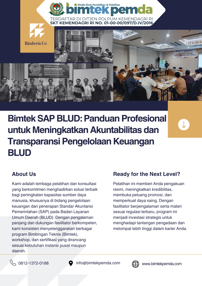 Ikuti program pelatihan dan pendampingan Bimtek SAP BLUD bersama lembaga terpercaya untuk mewujudkan pengelolaan keuangan daerah yang profesional, efisien, dan transparan!