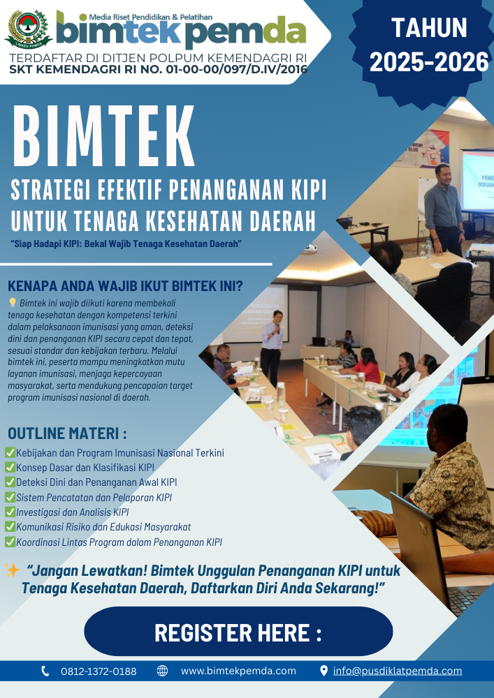 Tingkatkan kompetensi tenaga kesehatan di daerah Anda melalui Bimtek Strategi Efektif Penanganan KIPI demi pelayanan imunisasi yang aman, berkualitas, dan terpercaya.