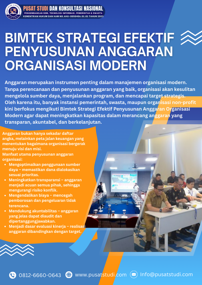 Anggaran merupakan instrumen penting dalam manajemen organisasi modern. Tanpa perencanaan dan penyusunan anggaran yang baik, organisasi akan kesulitan mengelola sumber daya, menjalankan program, dan mencapai target strategis. Oleh karena itu, banyak instansi pemerintah, swasta, maupun organisasi non-profit kini berfokus mengikuti Bimtek Strategi Efektif Penyusunan Anggaran Organisasi Modern agar dapat meningkatkan kapasitas dalam merancang anggaran yang transparan, akuntabel, dan berkelanjutan.