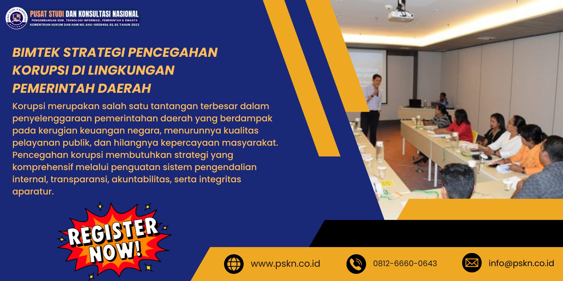Dengan Ini Kami Pusat Studi Konsultasi Nasional Mengundangan Bapak/Ibu Untuk Hadir dalam Bimbingan Teknis Dengan Tema ”Bimtek Strategi Pencegahan Korupsi di Lingkungan Pemerintah Daerah”