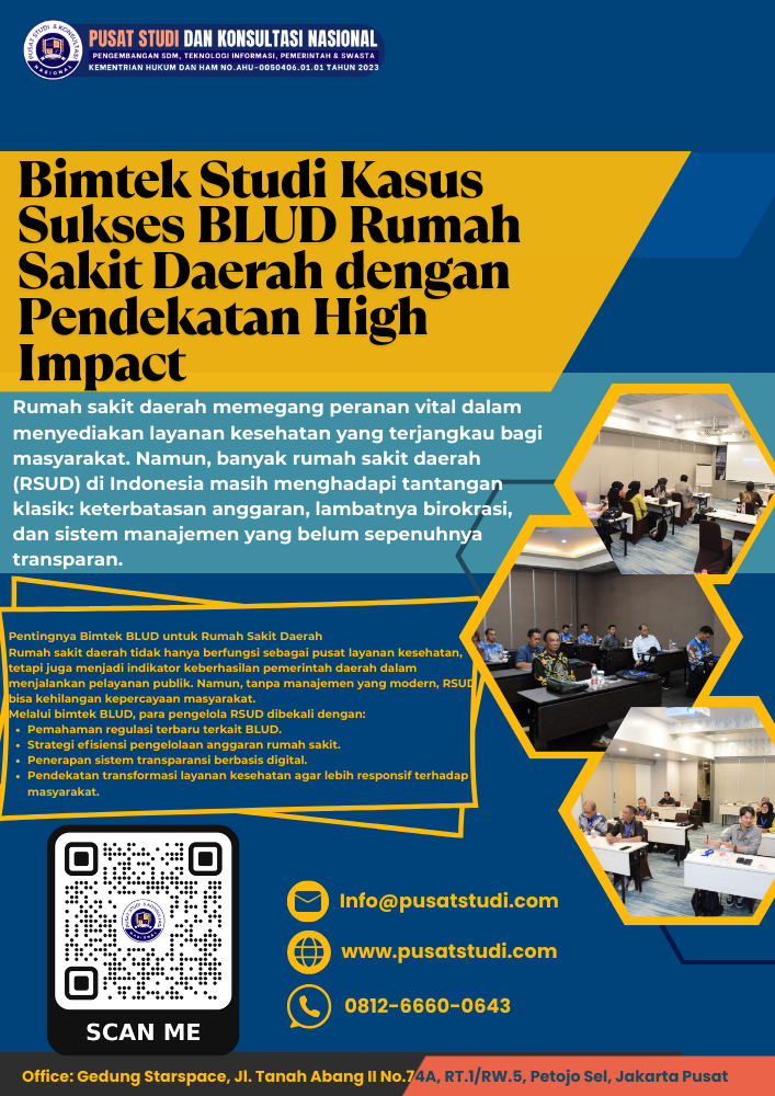 Bimtek studi kasus sukses BLUD rumah sakit daerah dengan pendekatan High Impact hadir untuk meningkatkan efisiensi, transparansi, dan transformasi layanan kesehatan.