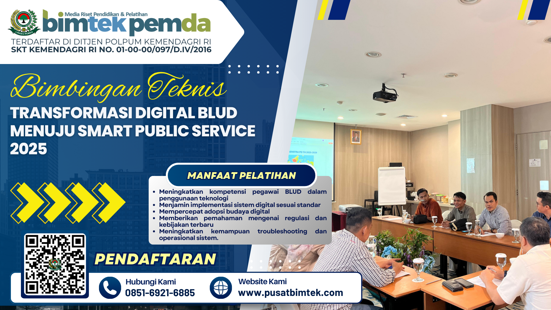 Transformasi digital telah menjadi kebutuhan utama bagi setiap Badan Layanan Umum Daerah (BLUD) yang ingin meningkatkan kualitas layanan publik. Memasuki tahun 2025, tuntutan masyarakat terhadap layanan yang cepat, transparan, dan berbasis teknologi semakin tinggi. Oleh karena itu, program Bimtek Transformasi Digital BLUD menjadi langkah strategis untuk memastikan bahwa BLUD mampu beradaptasi dengan perkembangan teknologi dan memenuhi standar pelayanan yang modern.