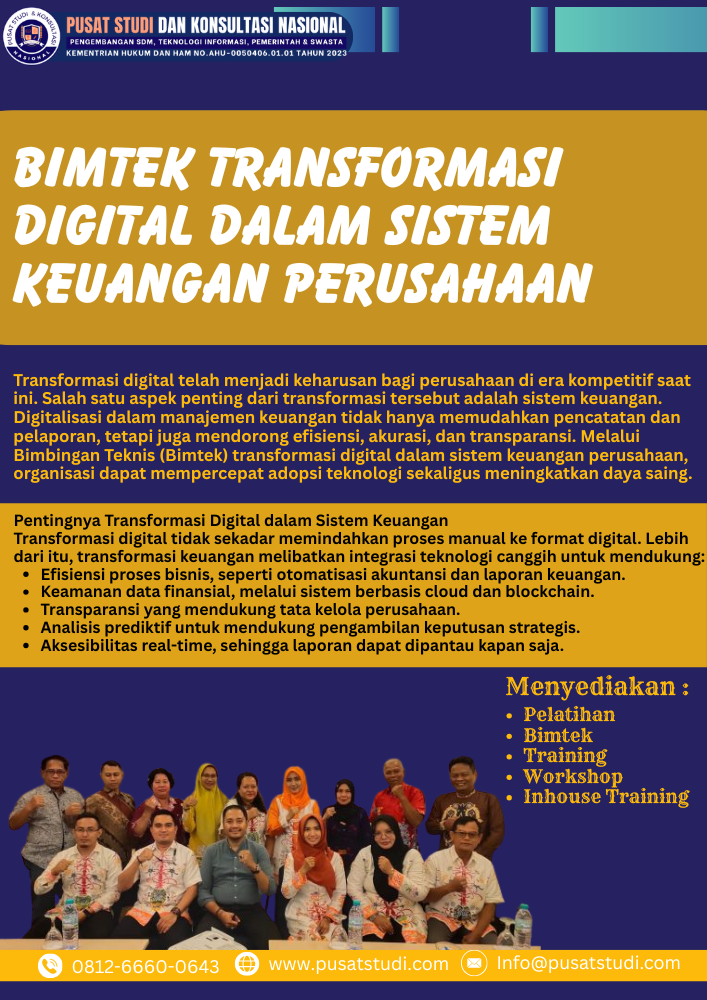 Transformasi digital telah menjadi keharusan bagi perusahaan di era kompetitif saat ini. Salah satu aspek penting dari transformasi tersebut adalah sistem keuangan. Digitalisasi dalam manajemen keuangan tidak hanya memudahkan pencatatan dan pelaporan, tetapi juga mendorong efisiensi, akurasi, dan transparansi. Melalui Bimbingan Teknis (Bimtek) transformasi digital dalam sistem keuangan perusahaan, organisasi dapat mempercepat adopsi teknologi sekaligus meningkatkan daya saing.