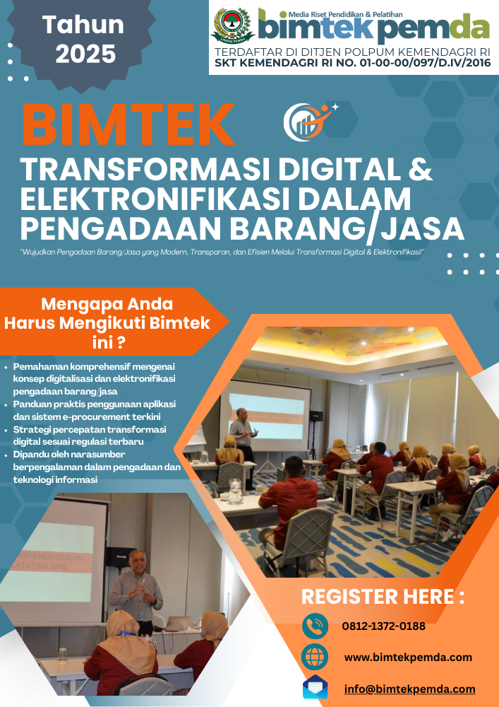 Transformasi digital dan elektronifikasi kini menjadi kunci penting dalam tata kelola pengadaan barang dan jasa pemerintah. Di era modern, kebutuhan untuk menghadirkan sistem yang transparan, efisien, serta akuntabel semakin mendesak. Melalui Bimbingan Teknis (Bimtek) Transformasi Digital & Elektronifikasi, instansi pemerintah dapat memahami regulasi terbaru, memanfaatkan teknologi, dan membangun kapasitas sumber daya manusia dalam mendukung pengadaan yang sesuai standar global.