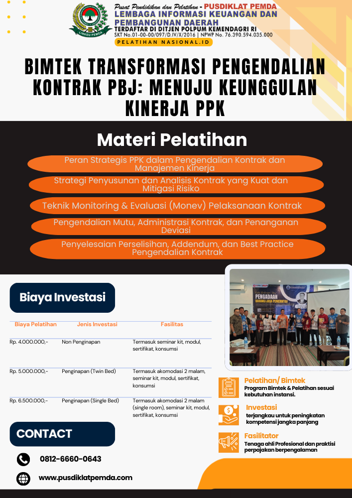 Pengendalian kontrak merupakan pilar penting dalam keberhasilan pengadaan barang/jasa pemerintah. Transformasi cara kerja PPK melalui penguatan proses, kompetensi, dan teknologi akan menghasilkan kinerja unggul dan akuntabel. Dengan mengikuti Bimtek Transformasi Pengendalian Kontrak PBJ, aparatur akan mampu mengelola kontrak secara profesional serta memberikan kepastian kualitas dan manfaat bagi instansi maupun masyarakat.