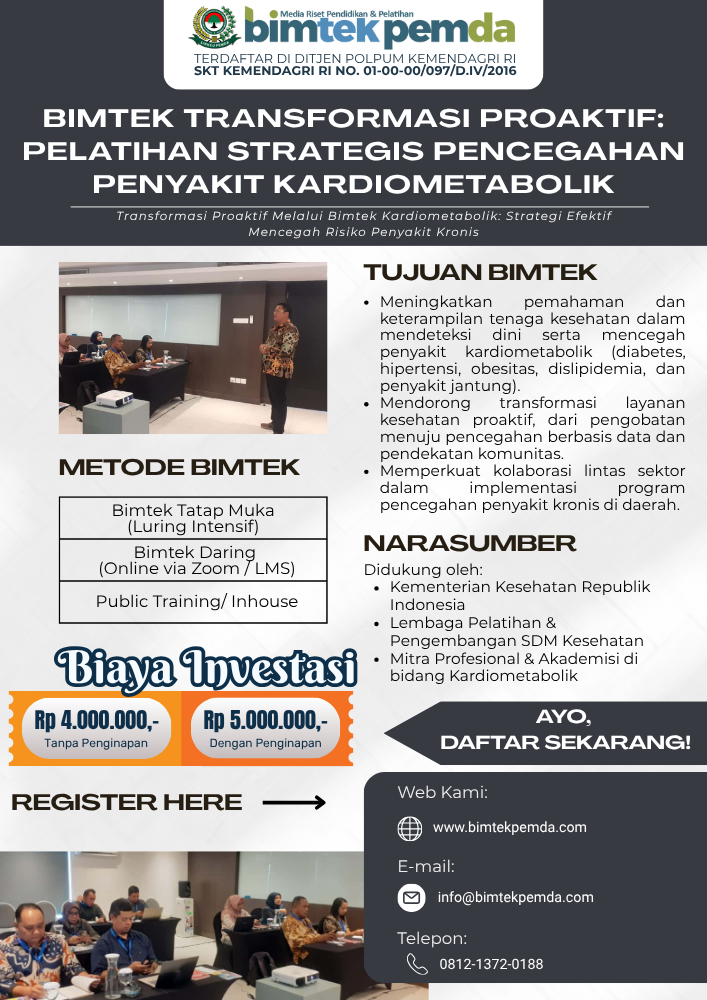 Kesehatan masyarakat Indonesia menghadapi tantangan besar dalam mengendalikan penyakit tidak menular, terutama kelompok penyakit kardiometabolik seperti diabetes, hipertensi, obesitas, dan dislipidemia. Angka kejadiannya meningkat pesat seiring perubahan gaya hidup dan pola makan masyarakat modern. Menyadari urgensi ini, pemerintah dan lembaga pelatihan kesehatan menghadirkan Bimtek Transformasi Proaktif: Pelatihan Strategis Pencegahan Penyakit Kardiometabolik, yang menjadi langkah konkret dalam memperkuat tenaga kesehatan agar mampu beradaptasi dan bertindak cepat menghadapi tren penyakit kronis yang terus meningkat.