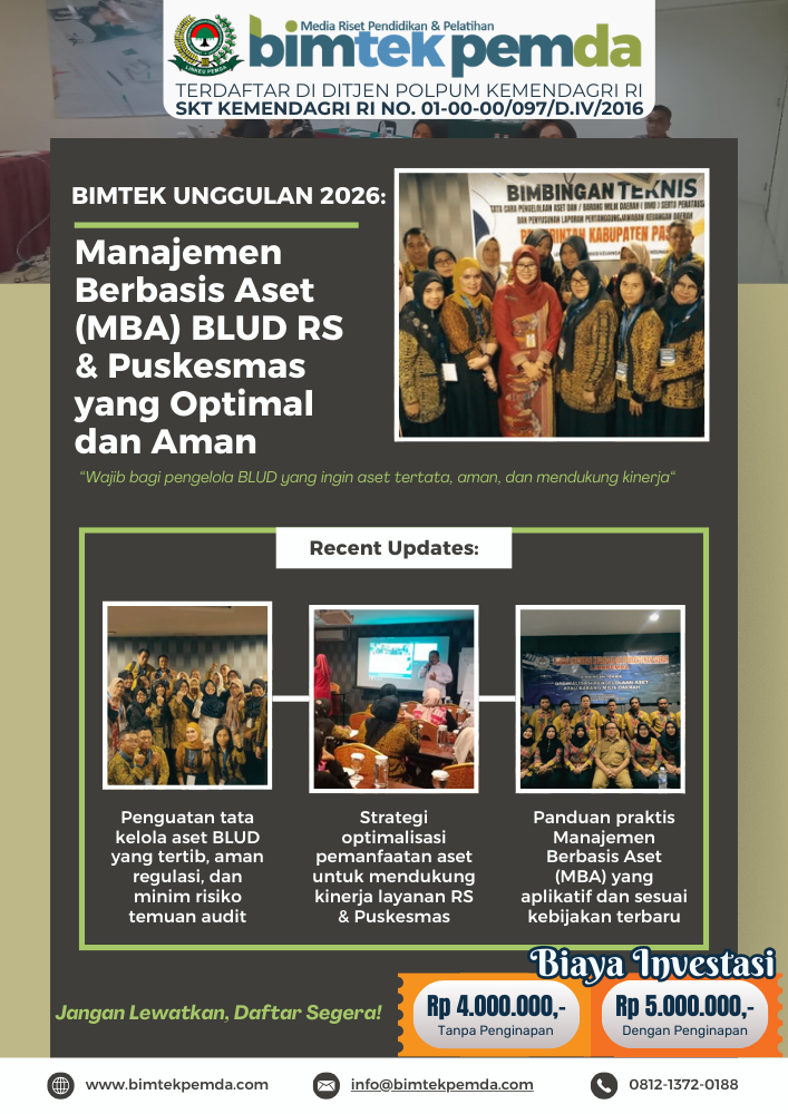 Memasuki tahun 2026, pemerintah daerah dan unit BLUD dituntut untuk menerapkan Manajemen Berbasis Aset (MBA) secara profesional, terintegrasi, dan patuh regulasi. Oleh karena itu, Bimtek Unggulan 2026: Manajemen Berbasis Aset (MBA) BLUD RS & Puskesmas hadir sebagai solusi strategis untuk meningkatkan kapasitas SDM, memperkuat tata kelola, serta meminimalkan risiko temuan audit dan kerugian daerah.