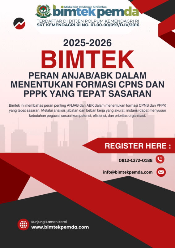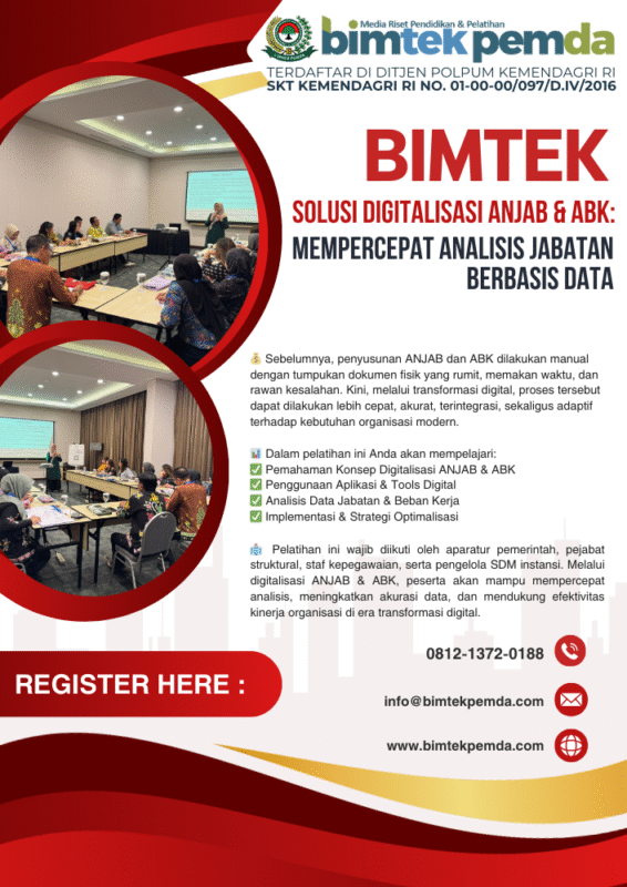 24 Sep Bimtek Pemda Solusi Digitalisasi ANJAB & ABK: Mempercepat Analisis Jabatan Berbasis Data Ditulis oleh Pusat Diklat Pemerintahan 24/09/2025 Lanjutkan membaca