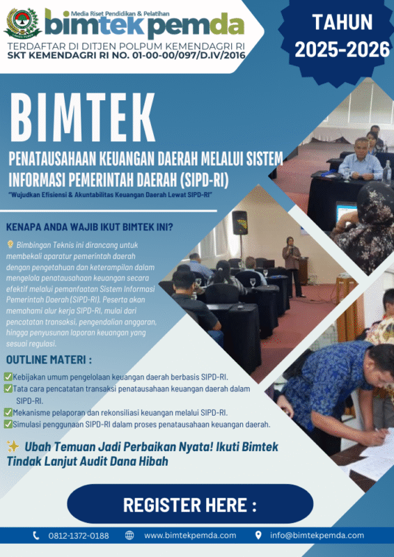 29 Sep Bimtek Pemda Bimtek Penatausahaan Keuangan Daerah Melalui Sistem Informasi Pemerintah Daerah (SIPD-RI) Ditulis oleh Pusat Diklat Pemerintahan 29/09/2025 Lanjutkan membaca
