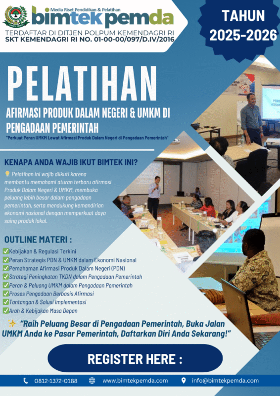 30 Sep Bimtek Pemda Pelatihan Afirmasi Produk Dalam Negeri & UMKM di Pengadaan Pemerintah Ditulis oleh Pusat Diklat Pemerintahan 30/09/2025 Lanjutkan membaca