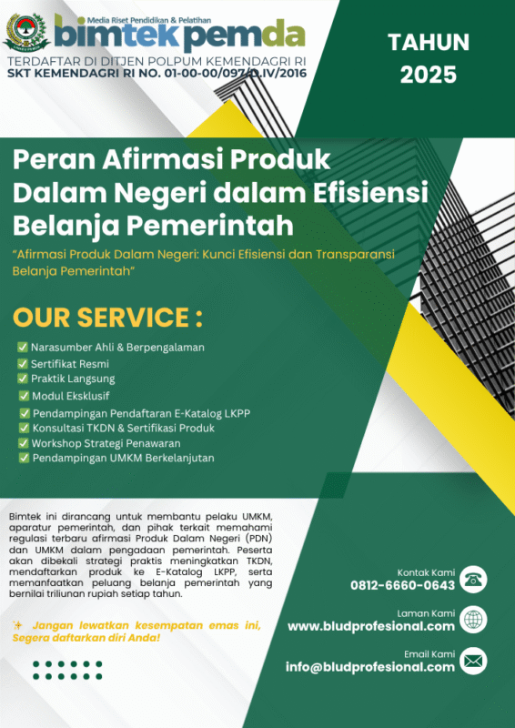 30 Sep Bimtek Pemda Peran Afirmasi Produk Dalam Negeri dalam Efisiensi Belanja Pemerintah Ditulis oleh Pusat Diklat Pemerintahan 30/09/2025 Lanjutkan membaca