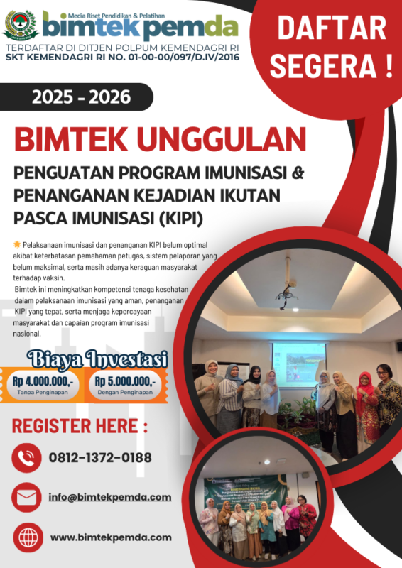 18 Des Bimtek Pemda Bimtek Unggulan Penguatan Program Imunisasi & Penanganan Kejadian Ikutan Pasca Imunisasi (KIPI) Ditulis oleh Pusat Diklat Pemerintahan 18/12/2025 Lanjutkan membaca