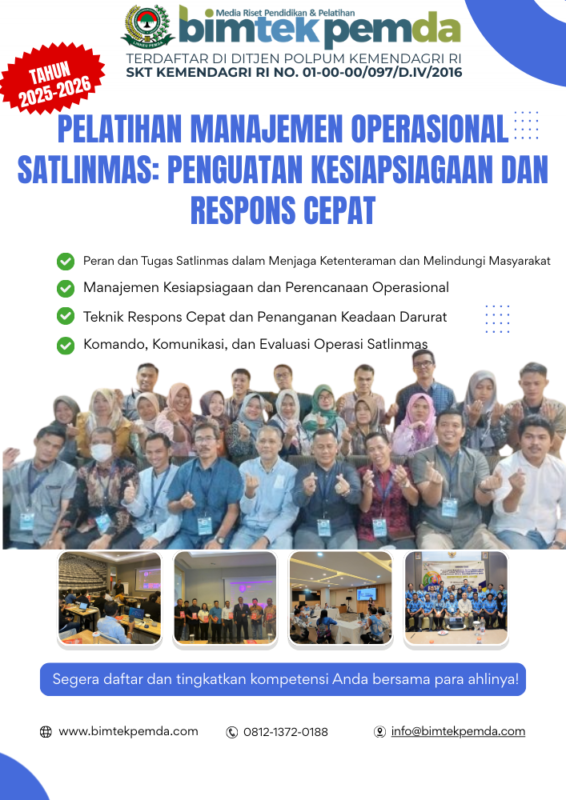 19 Des Bimtek Pemda Pelatihan Manajemen Operasional Satlinmas: Penguatan Kesiapsiagaan dan Respons Cepat Ditulis oleh Pusat Diklat Pemerintahan 19/12/2025 Lanjutkan membaca