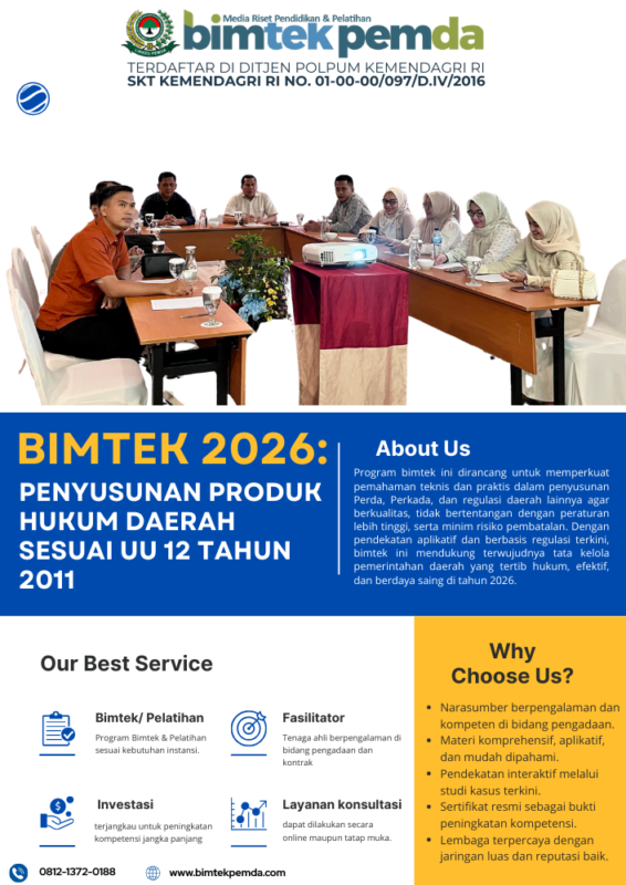05 Jan Bimtek Pemda Bimtek 2026: Penyusunan Produk Hukum Daerah Sesuai UU 12 Tahun 2011 Ditulis oleh Pusat Diklat Pemerintahan 05/01/2026 Lanjutkan membaca