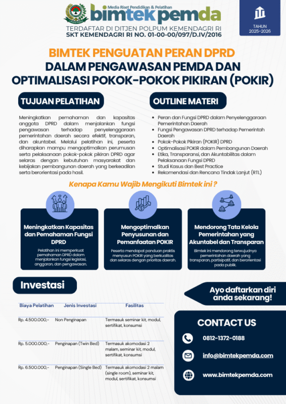 07 Nov Bimtek Pemda Bimtek Penguatan Peran DPRD dalam Pengawasan Pemda dan Optimalisasi Pokok-Pokok Pikiran (POKIR) Ditulis oleh Pusat Diklat Pemerintahan 07/11/2025 Lanjutkan membaca