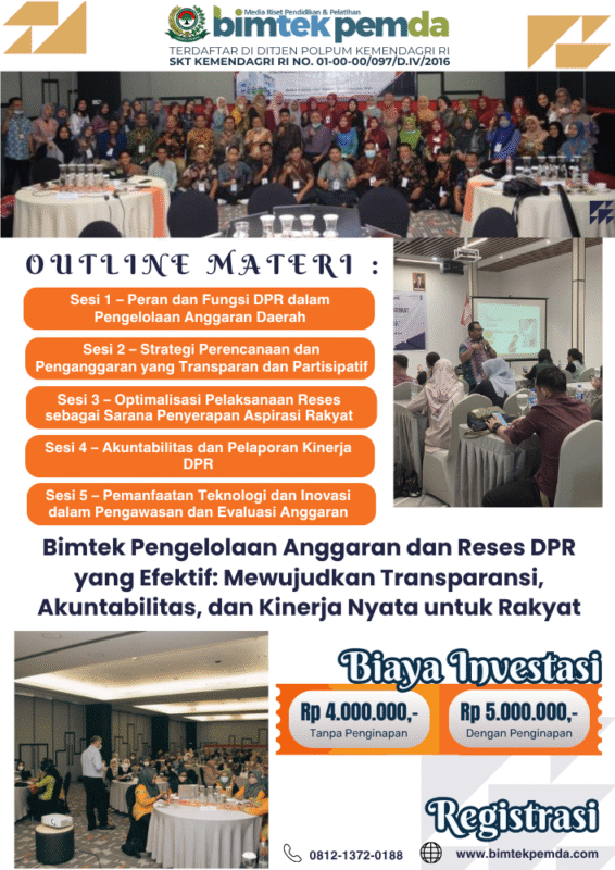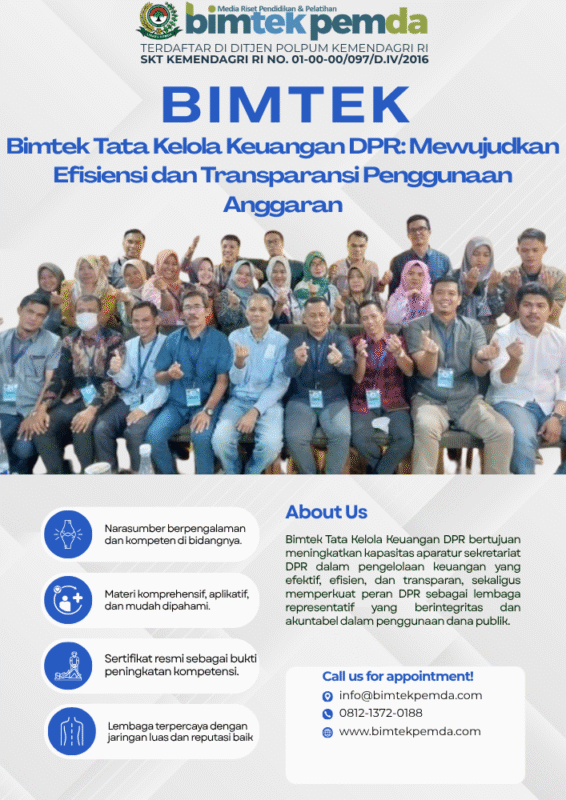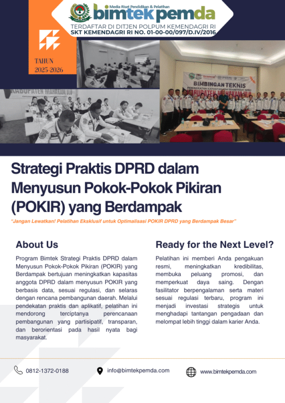 11 Nov Bimtek Pemda Bimtek Pengelolaan Anggaran dan Reses DPR yang Efektif: Mewujudkan Transparansi, Akuntabilitas, dan Kinerja Nyata untuk Rakyat Ditulis oleh Pusat Diklat Pemerintahan 11/11/2025 Lanjutkan membaca