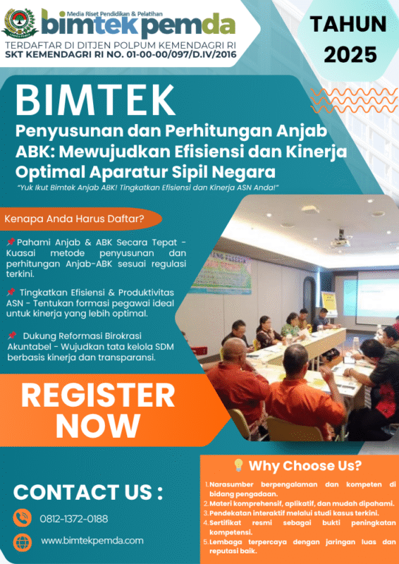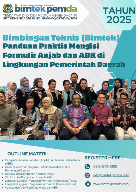 10 Nov Bimtek Pemda Bimtek Penyusunan dan Perhitungan Anjab ABK: Mewujudkan Efisiensi dan Kinerja Optimal Aparatur Sipil Negara Ditulis oleh Pusat Diklat Pemerintahan 10/11/2025 Lanjutkan membaca