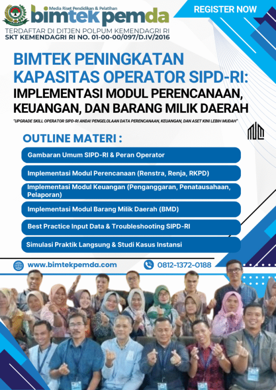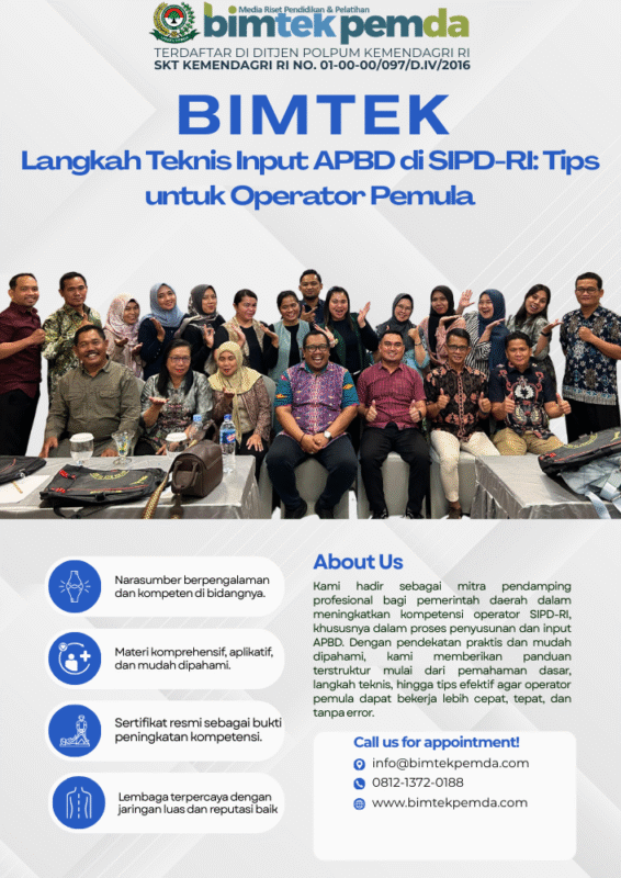 25 Nov Bimtek Pemda Langkah Teknis Input APBD di SIPD-RI: Tips untuk Operator Pemula Ditulis oleh Pusat Diklat Pemerintahan 25/11/2025 Lanjutkan membaca