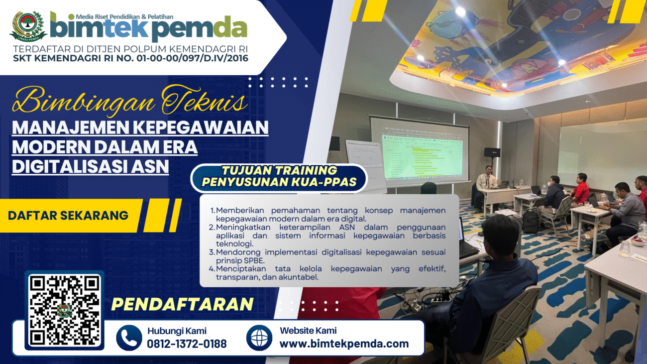 02 Sep Pusat Bimtek Bimbingan Teknis (BIMTEK) Perencanaan Kebutuhan Pegawai Berbasis Analisis Jabatan dan Beban Kerja Ditulis oleh Pusat Diklat Pemerintahan 02/09/2025 Lanjutkan membaca