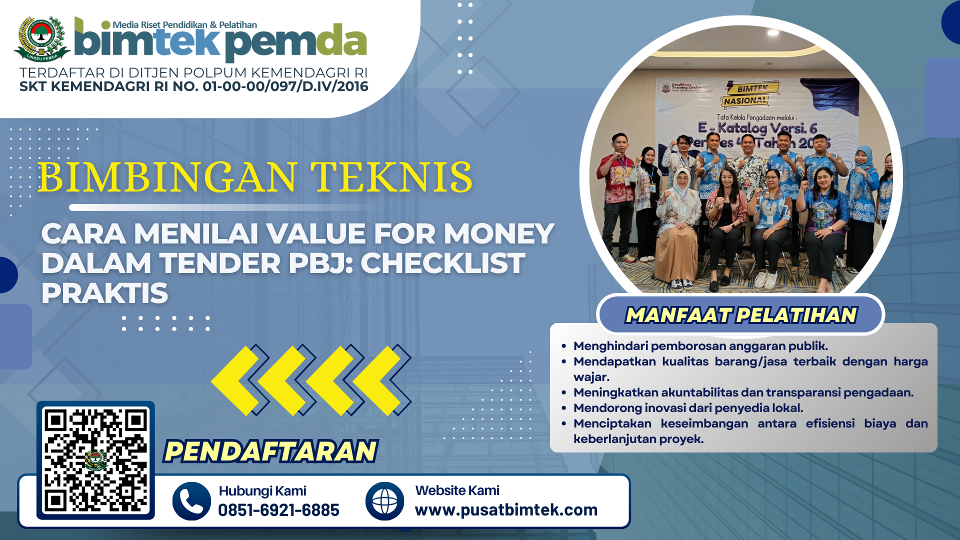 Ikuti pelatihan dan bimtek PBJ 2025 untuk memperkuat kompetensi aparatur dalam menilai, mengelola, dan mengoptimalkan setiap rupiah anggaran agar benar-benar memberi manfaat maksimal bagi masyarakat dan pembangunan nasional.