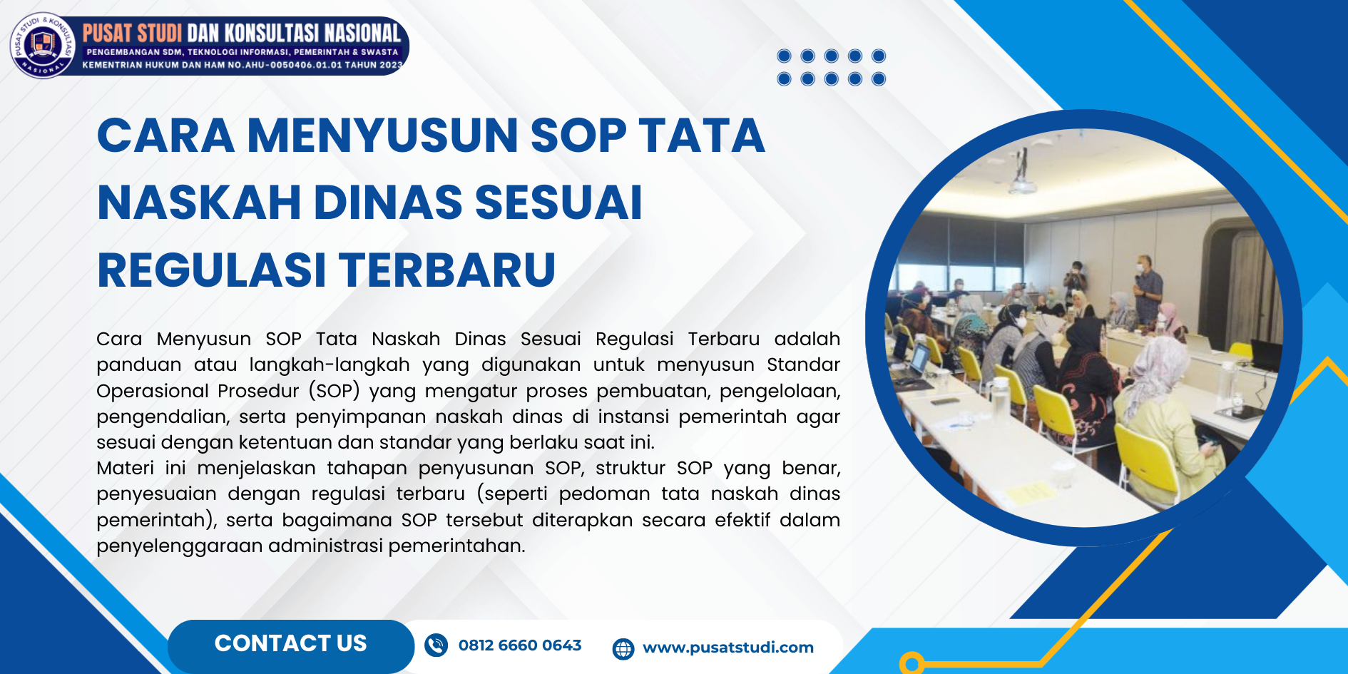 Hubungi kami untuk mendapatkan pelatihan penyusunan Tata Naskah Dinas terbaru yang komprehensif dan siap diterapkan.