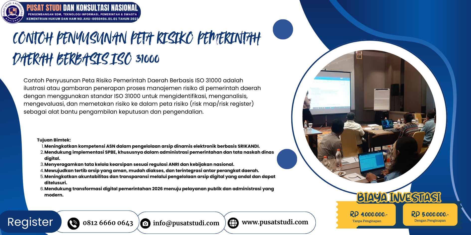 Artikel ini menyajikan contoh penyusunan peta risiko pemerintah daerah berbasis ISO 31000 secara sistematis dan mudah dipahami, mulai dari konsep dasar, tahapan penyusunan, hingga contoh tabel dan studi kasus. Pembahasan ini dirancang sebagai konten pendukung dari artikel Bimtek Manajemen Risiko Pemerintah Berbasis ISO 31000 2026, sehingga dapat menjadi rujukan praktis bagi ASN dan pimpinan daerah.