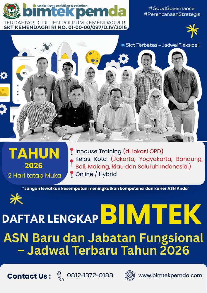 Pendaftaran bimtek dan pelatihan ASN tahun 2026 kini dibuka untuk instansi pusat dan daerah, tersedia dalam format tatap muka, daring, maupun inhouse, dengan materi terupdate dan narasumber berpengalaman.