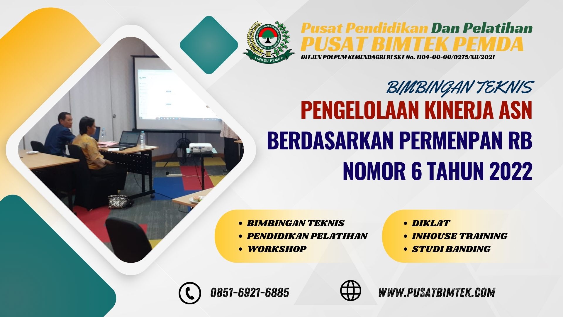 Sehubungan dengan hal tersebut diatas, kami dari PUSAT BIMTEK PEMDA , Selaku penyelenggara kegiatan serta dukungan narasumber yang berkompoten dibidangnya, Mengudang Bapak/Ibu untuk mengikuti kegiatan bimtek nasional dengan Tema : “Jadwal Bimtek Pengelolaan Kinerja ASN berdasarkan PERMENPAN RB Nomor 6 Tahun 2022” untuk informasi lebih lanjut dapat menghubungi: