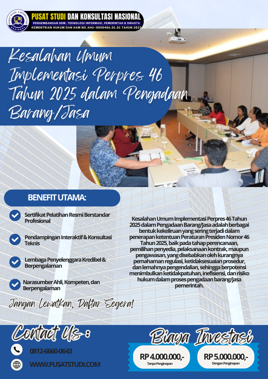 Pemahaman yang komprehensif dapat diperoleh melalui Bimtek Penerapan Peraturan Presiden No. 46 Tahun 2025 dalam Pengadaan Barang/Jasa 2026 sebagai rujukan utama peningkatan kapasitas PBJP.