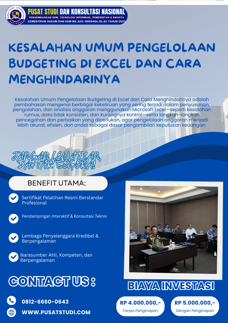 Tingkatkan kualitas perencanaan dan pengendalian keuangan organisasi Anda dengan menghindari kesalahan umum pengelolaan budgeting di Excel melalui penerapan praktik Excel lanjutan yang sistematis, akurat, dan profesional.